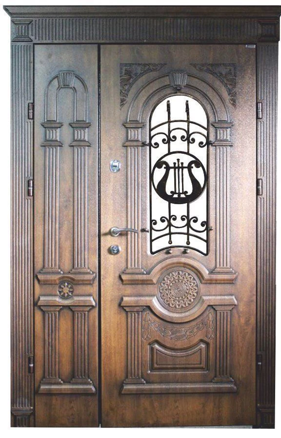 Парадные двери относятся к изделиям премиум-класса. Изготавливаются такие модели из металла толщиной не менее 2,0 мм, конструкция усиливается ребрами жесткости. Основной фактор, делающий парадные двери таковыми – их внешняя отделка. Для декора этих дверей, как правило, используют массив дуба, ясеня или сосны, натуральный шпон, корабельную фанеру, МДФ-панель, покрытую атмосфероустойчивой пленкой Винорит (VINORIT). Декоративные вставки из антивандального стекла, с применением элементов ковки, рисунок, который будет сочетаться с рисунком решеток на окнах, придаст коттеджу неповторимый внешний вид. Можно декорировать дверь витражным узором – и ваш дом заиграет яркими красками. По конструкции парадные двери могут быть как одностворчатыми, так и двустворчатым. При достаточной высоте проема, можно изготовить входную группу с декоративной вставкой сверху – прямоугольную или в виде арки. Терморазрыв в конструкции парадной двери сохранит тепло в доме, и предотвратит промерзание и кондедсирование двери в холодное время года, при этом не требуется обустройство в доме холодного тамбура.